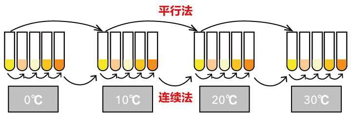 這個(gè)方法就是為每一個(gè)測(cè)試溫度準(zhǔn)備一個(gè)水浴,然后準(zhǔn)備不同批的樣品放置在不同的溫度的水浴中,即每一個(gè)樣品針對(duì)幾個(gè)不同的溫度必須準(zhǔn)備幾個(gè)相同的樣品放置在不同的水浴中,第一個(gè)樣品的第一個(gè)溫度測(cè)定后、立即測(cè)定第一個(gè)樣品的第二個(gè)溫度、然后測(cè)定第一個(gè)樣品的第三個(gè)溫度,待第一個(gè)樣品測(cè)試結(jié)束后,再開(kāi)始測(cè)定第二個(gè)樣品的第一個(gè)溫度……依此類推。