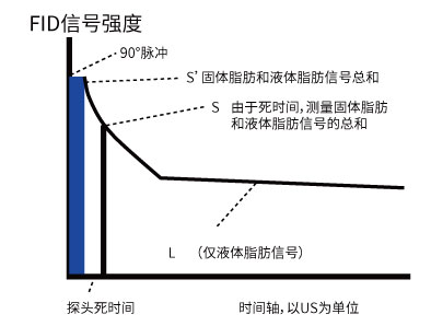 固態(tài)和液態(tài)脂肪中的H由于存在形式不同,在FID衰減曲線中表現(xiàn)出截然不同的特性。如下圖所示,固體脂肪信號(hào)衰減很快,一般在70微秒時(shí)已經(jīng)完全衰減。液體脂肪信號(hào)衰減較慢,一般認(rèn)為在70微秒處基本尚未損失。但是核磁共振信號(hào)采集存在一個(gè)特定的死時(shí)間,所以我們?cè)谒罆r(shí)間后采集到FID首點(diǎn)信號(hào)S時(shí),固體脂肪的一部信號(hào)已經(jīng)在死時(shí)間中衰減了(S’-S)。通過(guò)一定的信號(hào)處理即可得到固體脂肪含量SFC。