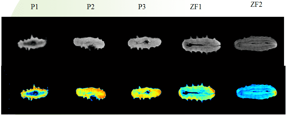 結論:在一定溫度下,隨著海參復水時間的延長(P1~P3,ZF1~ZF2),自由水含量不斷增大,水分流動性增大。T1加權像中反映越來越暗。T1加權像中弛豫時間越短,圖像越亮(偽彩圖中越紅)
