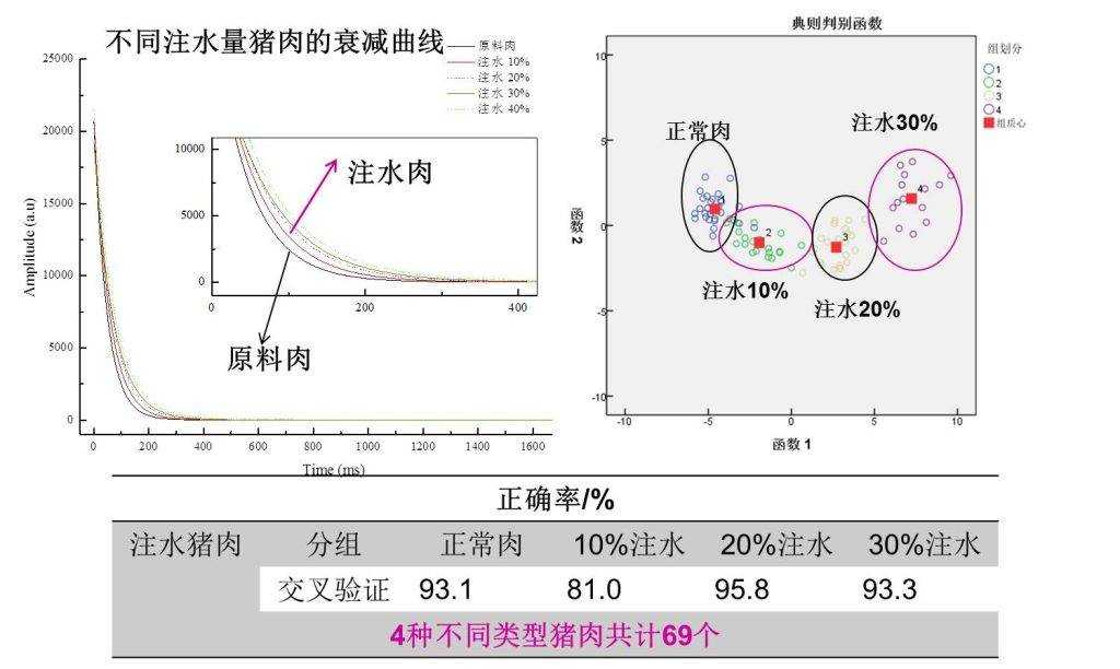 除鑒別注水肉之外,也能鑒別注射黃原膠、卡拉膠、魔芋膠等添加劑的非法豬肉,低場核磁共振的無損快速的優勢為其應用到食品安全的執法現場提供了可能。