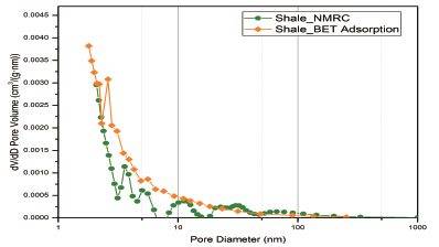 從上圖對比來看,低溫核磁法與氮氣吸附法測得的孔隙大體趨勢一致,而低溫核磁法在不同的位置表現出轉折點更多,表明核磁法能夠檢測到更為豐富的孔隙結構。