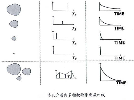 低場核磁共振技術利用油氣或者水中的氫原子核在磁場中具有共振并能產生信號的特性來探測油、氣、水及其分布和巖石物性參數。巖石中,不同大小的孔隙喉道構成巖石孔隙,弛豫時間顯示的是孔隙大小的特征。因此T2譜顯示了巖石的孔徑大小分布,孔隙的尺寸越大,對應的弛豫時間越長,T2分布曲線越靠右側;孔隙尺寸越小,對應的弛豫時間越短,T2分布曲線越靠近左側。