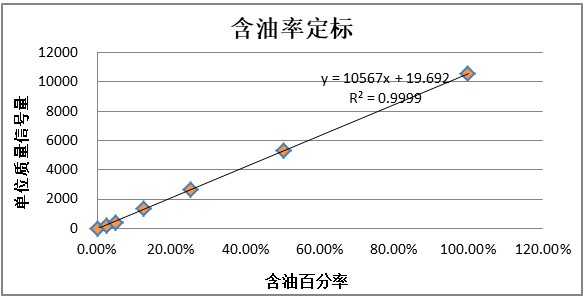 對(duì)于含油率測量,根據(jù)國家標(biāo)準(zhǔn)規(guī)定,油信號(hào)只出現(xiàn)在TE為7ms以后,于是,取CPMG序列采得回波串中TE為7ms的峰點(diǎn)為含油率定標(biāo)和測量的基本對(duì)象,將各樣品的該信號(hào)值轉(zhuǎn)化為單位質(zhì)量信號(hào),則可得到一條描述標(biāo)樣含油百分量及其單位質(zhì)量信號(hào)關(guān)系的直線,該線即為本實(shí)驗(yàn)中起到關(guān)鍵作用的標(biāo)線。將得到的測量樣品的單位質(zhì)量信號(hào)代入標(biāo)線,即可求得各測量樣品的含油百分量。