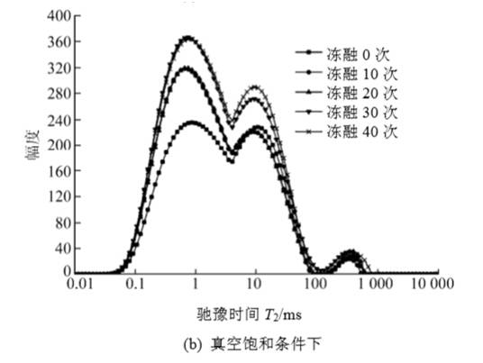 經過40 次凍融循環后,花崗巖的T2 譜分布主要表現為3 個峰圖,隨著凍融次數的增加,T2譜形態上發生了左移,即向小孔隙的T2 譜方向偏移。這也說明了在冰的凍脹和融縮作用下,巖石內部產生了新的微孔隙。