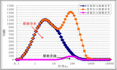 在原始狀態下,測試地層取心巖樣的T2弛豫譜,相應的峰面積對應的是原始含油含水飽和度。將巖心浸入錳離子溶液,抑制水的信號,此時進行T2譜測試得到原始含油飽和度,原始含油含水飽和度減去原始含油飽和度即獲得原始含水飽和度。