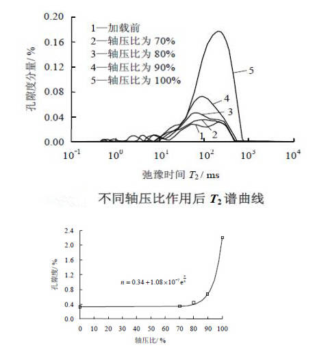 隨著軸壓的增大,孔隙度總體呈指數增長趨勢。當軸壓比處于0~70%段時,曲線斜率很小,巖石內部裂隙發育緩慢,損傷增量較小;當軸壓比處于70%~90%段時,曲線斜率明顯增大,孔隙度增量較大且增速越來越快,表明大理巖內部裂隙數量增多,裂紋開度增大,損傷程度加劇,大理巖逐漸由彈性變形向塑性變形轉化;當軸壓比處于90%~100%段時,曲線的斜率急劇增大,孔隙度成倍增加,巖石內部孔隙加速擴展和貫通,損傷急劇增加直至破壞。