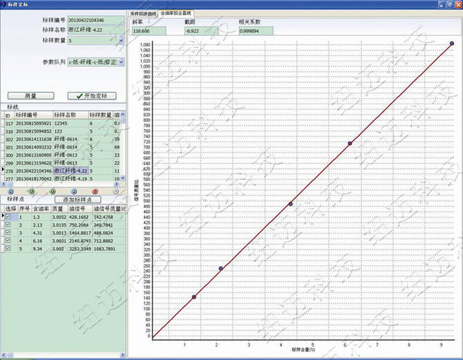 (2)定標:用無油絲配備不同含油率的樣品,采用CPMG的第二個回波的信號值,換算后和含油率做一條定標線(定標線的X軸為含油率,Y軸為單位質量樣品的油信號)