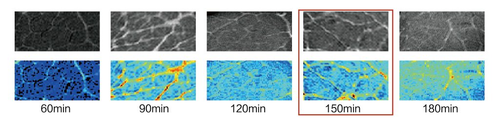 T1加權(quán)像中,網(wǎng)狀紋理是牛肉中脂肪,較暗的部分為牛肉中肌肉組織,隨著鹵制時間延長,脂肪溶解,網(wǎng)狀紋理變亮,隨后脂肪溶出,水分進入,圖像整體變亮,網(wǎng)狀紋理消失。