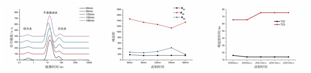 鹵制初期(60-90min):高溫破壞蛋白質(zhì)結(jié)構(gòu),水分由肌原纖維細胞內(nèi)部向外部遷移,不易流動水減少,自由水增加,高溫促使肌肉纖維收縮,對細胞內(nèi)水的束縛力增強,T22運動性降低,而肌肉蛋白網(wǎng)絡(luò)結(jié)構(gòu)破壞,持水力降低,T23運動性增強;高溫迫使部分結(jié)合水脫離蛋白質(zhì),含量減少;