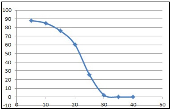 由于來自固體的NMR信號衰減比來自液體的NMR信號衰減快得多。因此,可以在FID(圖1)上的兩個(gè)點(diǎn)進(jìn)行測量,分別在“t1=11us”點(diǎn)進(jìn)行測量,該點(diǎn)對應(yīng)固體和液體信號的總和A1。在另一個(gè)點(diǎn)“t2=70us”進(jìn)行測量,該點(diǎn)固體信號已經(jīng)衰減到0,測試到的信號A2僅為液體信號。通過計(jì)算,即可得到樣品在對應(yīng)溫度下的固體脂肪含量。對多個(gè)溫度進(jìn)行測試,即可得到溫度與固體脂肪的變化曲線。
