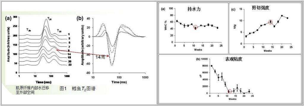 1.鱈魚在-10℃貯藏過程,肌原纖維內部水分發生遷移,肌原纖維內部及間隙中的水分轉移到外部空間,使得不易流動水含量逐漸降低,自由水含量逐漸增加,在貯藏10-14week時自由水含量達到最大,而此時持水力和表觀粘度也同時達到最低,剪切力達到最大;