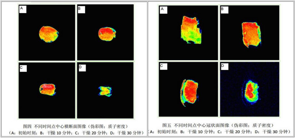 1.核磁共振成像中(圖四和圖五),顏色代表信號強度,紅色信號越大,氫質子密度越大,藍色信號越大,氫質子密度越小,通過核磁共振成像可明顯看出不同干燥時段水分的分布及變化;