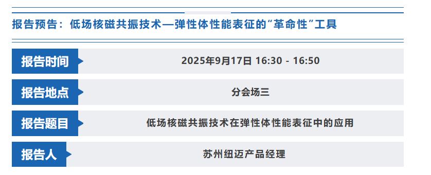 2025年9月17日下午16:30-16:50,分會場三,蘇州紐邁期待與您相遇,共同探討低場核磁共振技術的無限可能,攜手推動彈性體材料邁向更高性能、更綠色智能的未來!