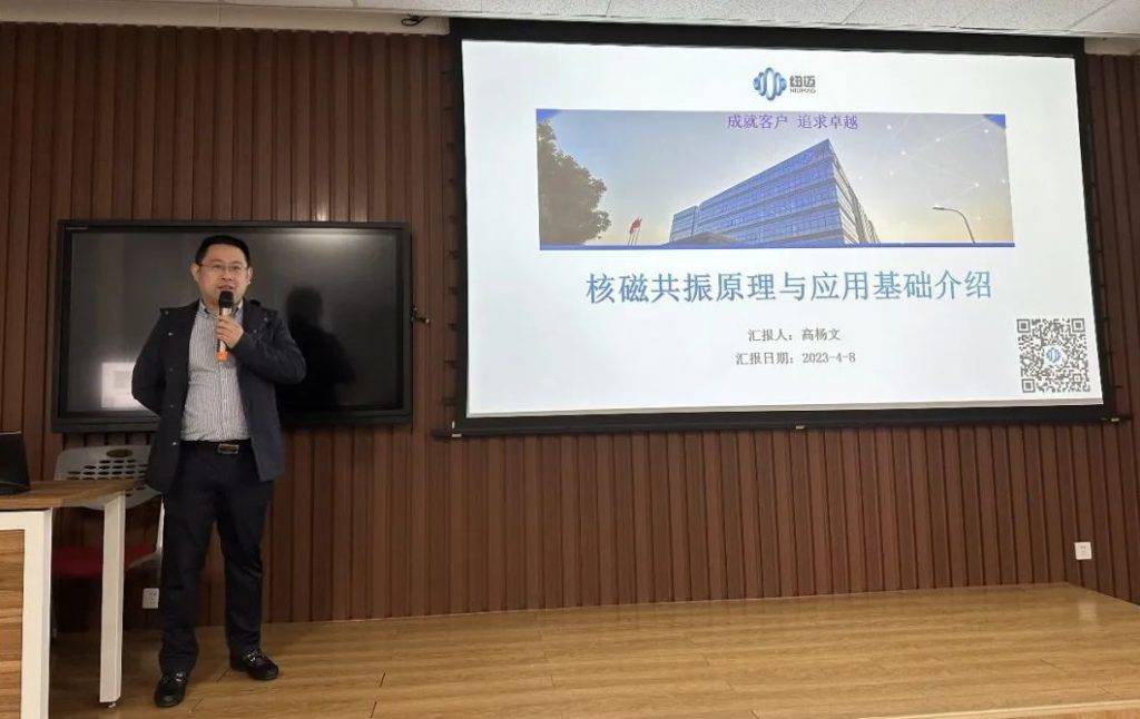 活動中,紐邁分析產品總監高楊文向在場師生介紹了紐邁的發展歷程、產品應用領域、低場磁共振技術原理等;