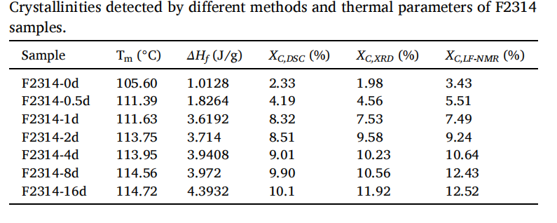 表1:通過不同方法檢測到的 F2314 樣品的結晶度及熱學參數。