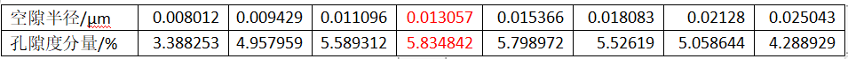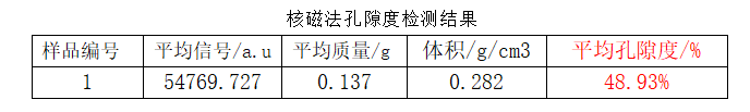 根據軟件模型的處理,低場核磁法將該樣品的孔徑分布結果完整的展現出來,根據結果可知,該樣品的孔隙度為48.93%,孔徑分布主要的分布峰頂點為13nm孔隙度分量為5.83%。(上表標紅出)