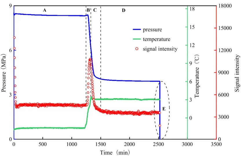 上圖為水合物生成過程中核磁信號(hào)的變化圖,將水合物的生成過程分為四個(gè)階段(A-D),依次為感應(yīng)階段、成核階段、生成階段、穩(wěn)定階段。