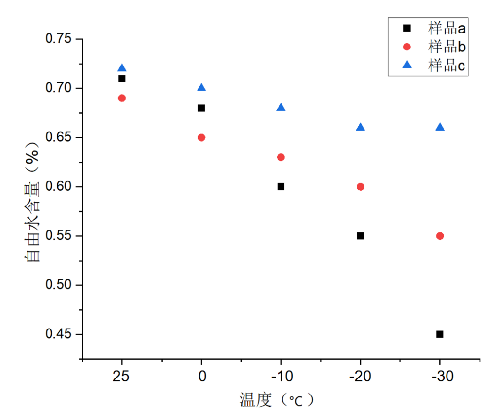 自由水的比例變化決定了水凝膠的抗凍性能,不同溫度下自由水比例變化越小,水凝膠越抗凍。從圖表中可以看出,隨著溫度的降低,樣品c中的自由水含量變化是最小的,也證明了樣品c的抗凍能力較a、b來(lái)說(shuō)更強(qiáng)。