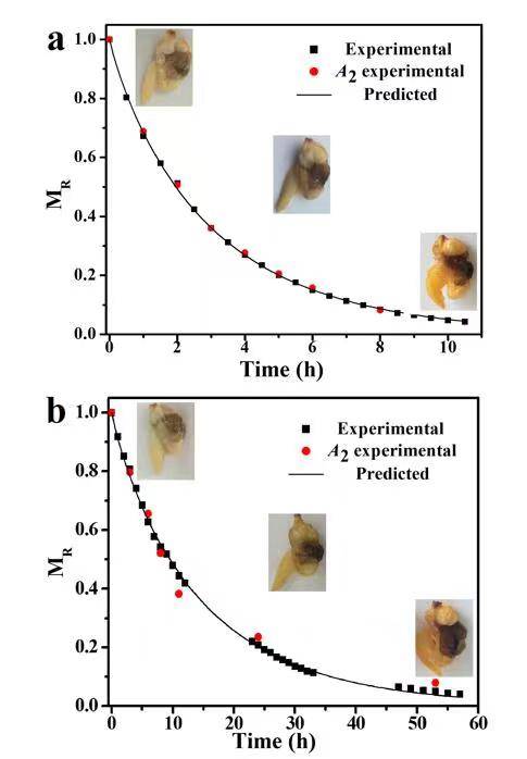 圖2.實際水分與核磁數據峰面積的熱風干燥曲線(a)和自然晾曬干燥曲線(b)