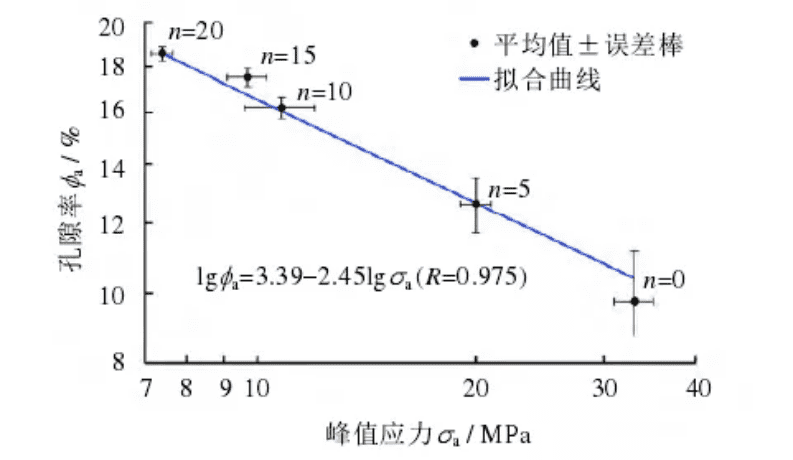 圖9為隨著循環次數的增加,峰值應力與孔隙率的關系曲線,從圖中可以看出,隨著孔隙率的增大與峰值應力呈現出正相關關系。