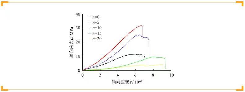 圖7為經過不同次數的干濕循環后,得到的干濕循環應力-應變曲線。從圖中可以看出,隨著循環次數的增加,峰前加載階段變化規律相似,峰后力學特性存在顯著差異。當循環次數較少時,試樣彈性階段較長,彈性模量較大,塑性區較短,巖樣呈脆性破壞;隨著干濕循環次數的增加,彈性模量逐漸變小,巖石由脆性向延性發展,達到峰值應力后還有較強的承載能力,循環次數越多,延性特征越明顯。