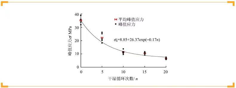 由于干濕循環次數對于泥質砂巖試樣是一個累積損傷的過程, 可以作出峰值應力與循環次數(圖8)。從圖中可以看出,每組樣品的平均峰值應力隨著循環次數的增加呈指數關系降低。