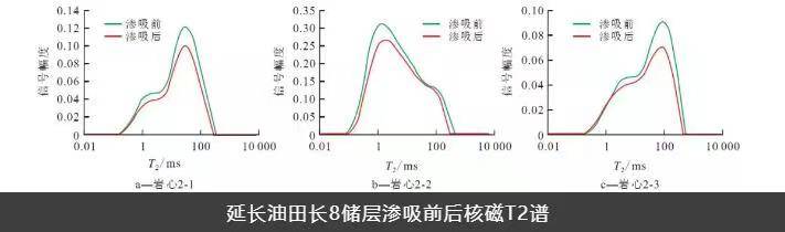 由滲吸前后核磁共振T2譜可以看出,在巖心樣品處于原始含油飽和度狀態(tài)時(shí),含油孔隙半徑分布表現(xiàn)為2個(gè)峰,左峰表示小孔隙部分,右峰表示大孔隙部分。自發(fā)滲吸實(shí)驗(yàn)后,左、右峰幅度比原始含油飽和度條件下測(cè)得的幅度均有減小,表明致密油儲(chǔ)層的孔隙半徑很小,而毛管壓力作用很大,具有較強(qiáng)的毛管滲吸作用,即巖心樣品小孔隙中的原油因毛管壓力作用吸入水而排出油,因此利用毛管壓力的滲吸作用,吸入水、排出油,對(duì)提高致密油儲(chǔ)層的采收率具有重要意義。