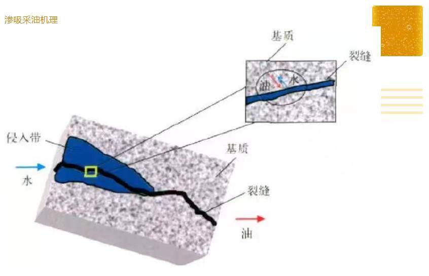滲吸作用是開采基質(zhì)孔隙原油的有效方法,但滲吸作用的動(dòng)力問題一直沒有得到很好的解決。一般認(rèn)為滲吸的動(dòng)力是毛管力作用下的潤濕性流體自發(fā)的吸入孔隙中驅(qū)替非潤濕流體的過程。根據(jù)滲吸方向,可分為同向滲吸和逆向滲吸;根據(jù)流體飽和順序,可分為油驅(qū)水過程和水驅(qū)油過程,如下圖。