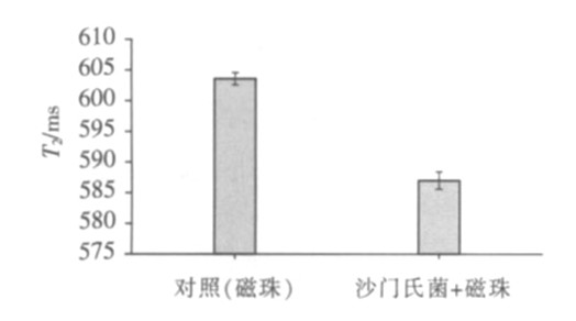 下圖顯示不加菌液的樣品(對照組磁珠)和加入沙門氏菌的樣品(磁珠+沙門氏菌)臺式小核磁檢測到的T2值差異,表明此方法可以用來對目標微生物進行檢測。