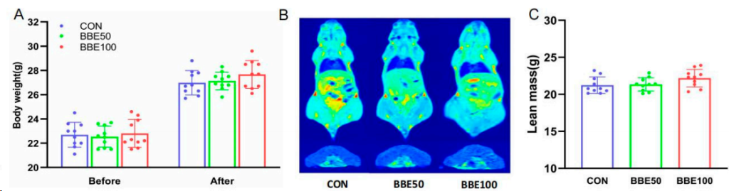 核心價值: 本研究利用 紐邁QMR 提供的精準(zhǔn)體成分?jǐn)?shù)據(jù),結(jié)合代謝籠的能量消耗數(shù) 據(jù),證實了“碧其”楊梅提取物(BBE)能通過增加快肌纖維比例,顯著提升小鼠的全 身基礎(chǔ)代謝率,從而實現(xiàn)“增肌減脂”的抗肥胖效果。