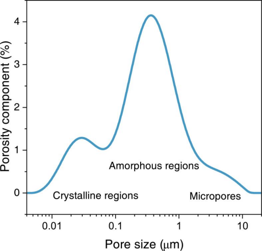 0.09 ms的超短T2時間歸屬于木質纖維素的質子弛豫。兩個較短的T2時間(2 ms和40 ms)分別歸因于納米級狹縫內的水,它們分別與纖維素的晶體區和非晶區相關。長T2時間(600 ms)歸屬于微米級木質部導管內的水。上述結果通過孔徑分布分析進一步得到證實。非晶區水的T2振幅遠高于其他區域,表明水主要集中在木質部導管壁內纖維的非晶區。同時,木質部導管僅含極少量的水,表明這些導管內存在大量的空洞。