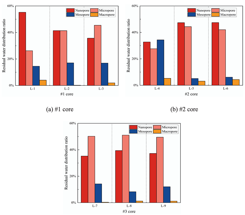 (3)核磁共振分析表明,驅水效率受孔隙結構的控制。大孔中的水優先被驅替,而納米孔和微孔則是主要的儲存空間,容納了高達90%的殘留水。這一定量結果突顯了從小孔中回收水的關鍵挑戰。