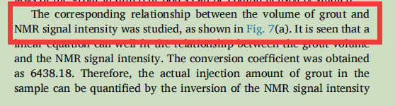 通過對不同體積漿液進行核磁共振測試,可以擬合得到核磁信號強度與漿液體積間的定量關系,據此可對注漿過程中進入試樣的實際漿液注入量進行定量反演。