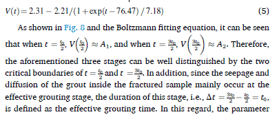從圖中可以發現,采用玻爾茲曼方程可以很好的擬合漿液注入量與注漿時間的變化關系。進一步地,通過擬合方程,我們可以定義有效注漿時間(即有效注漿階段的持續時間)、漿液充填速率(即有效注漿階段曲線的斜率)2個指標對不同條件下注漿滲透擴散特性進行深入分析。