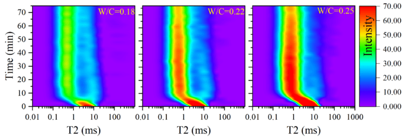LF-NMR的主要原理是表征氫質子在自由水中的弛豫行為。不同直徑孔隙中的水分子表現出不同的縱向/橫向弛豫時間和弛豫信號強度。通過監測游離水向化學鍵合水的轉化過程,也可以對膠凝材料的水化動力學進行研究。