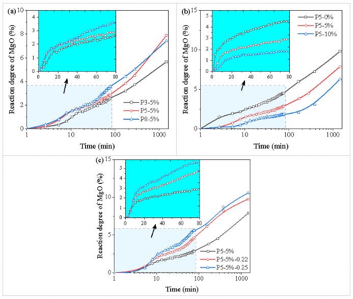 圖5 MgO反應度的原位表征結果:(a)在不同M/P摩爾比的情況下;(b)在不同B/M比的情況下;(c)在不同W/C比的情況下